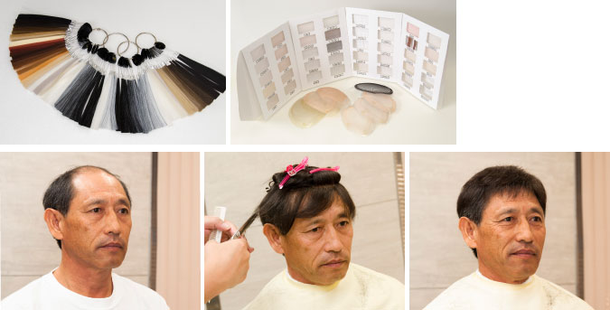 頭の型取りをし、希望の髪の色にあつらえたカツラを希望の髪型にカットしていきます。
